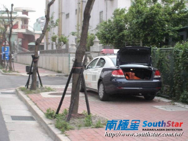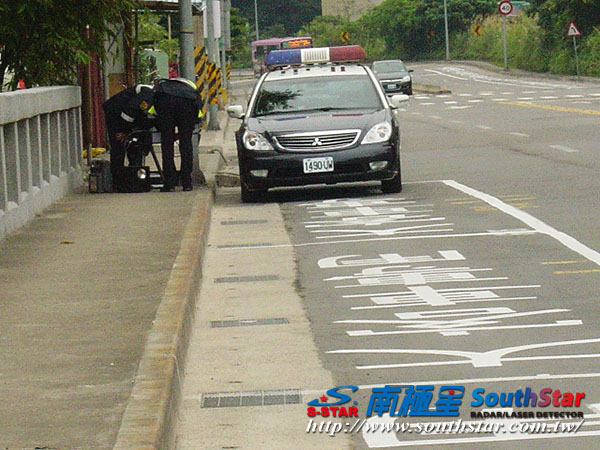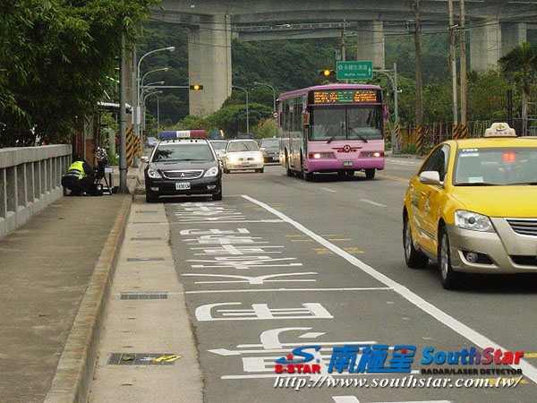 台北市環河北路北向往士林方向台北大橋前 ,德製 TraffiPax K 頻移動式測速照相系統,此系統主機實際為固定桿內部主機,採用落地方式架設於路旁警車前方, 照車尾此處常會出現移動測速, 有時採用 Gatso 系統