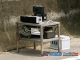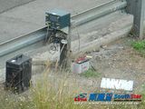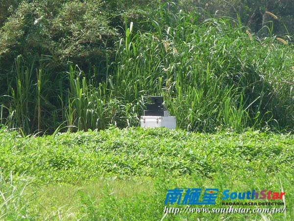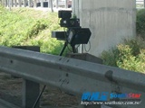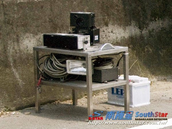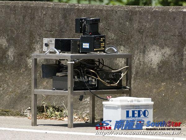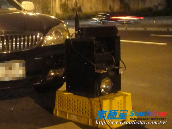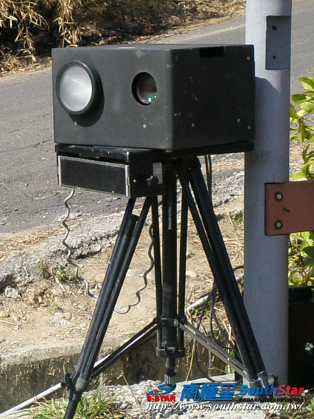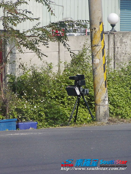 國道一號 315K 台南系統交流道下,荷製 Gatso 24 K 頻移動式測速照相系統, 系統配置 150mm 望遠鏡頭, 標準三角架方式架設於護欄外, 照車尾 |