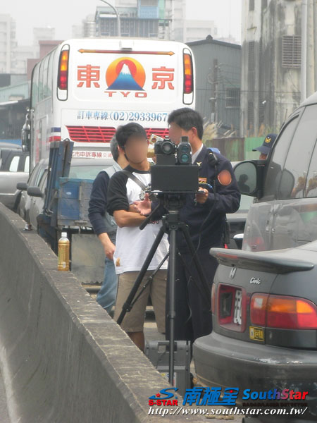為目前國道上出現率最高的雷射測速照相系統採用三腳架架設, 拍攝北向車道超速車輛車尾 |