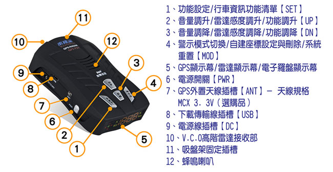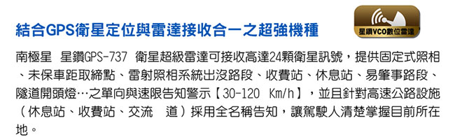 南極星 星鑽 GPS-737 衛星超級雷達結合電子羅盤、電子時速表,可顯示車輛車速、行進方向以及車輛與測速照相設置地點之相對距離,完全掌握前方路況。