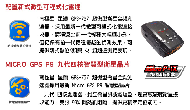 南極星 星鑽 GPS-767 衛星超級雷達採用最新 Micro GPS P9 智慧型晶片,九代四核處理器、獨立衛星訊號處理器、超高敏感度衛星接收能力,克服 99% 隔熱紙阻隔,提供更精準定位能力。
