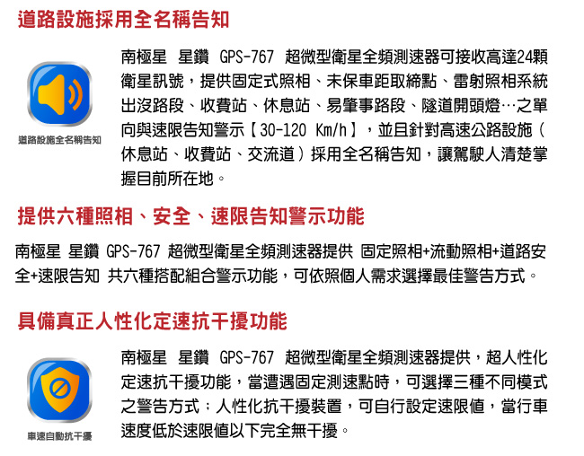 南極星 星鑽 GPS-767衛星超級雷達可接收高達24顆衛星訊號,提供固定式照相、未保車距取締點、雷射照相系統出沒路段、收費站、休息站、易肇事路段、隧道開頭燈…之單向與速限告知警示【30-120 Km/h】,並且針對高速公路設施(休息站、收費站、交流道)採用全名稱告知,讓駕駛人清楚掌握目前所在地。