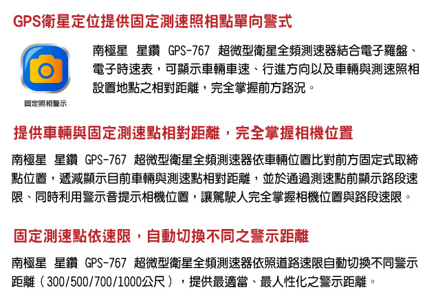 南極星 星鑽 GPS-767衛星超級雷達依據車輛目前位置比對前方固定照相取締點位置,遞減顯示目前車輛與測速點相對距離,並於通過測速點前顯示路段速限、同時利用警音提示相機位置,讓駕駛人完全掌握相機位置與路段速限。