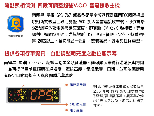 南極星 星鑽 GPS-767衛星超級雷達結合電子羅盤、電子時速表,可顯示車輛車速、行進方向以及車輛與測速照相設置地點之相對距離,完全掌握前方路況。