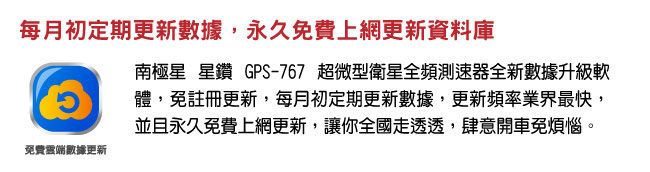 南極星 星鑽 GPS-767衛星雷達的完整資料庫,可提供固定式照相種類以及取締路段單向語音告知【固定測速照相、闖紅燈測速照相、雷達測速照相、高架橋上、