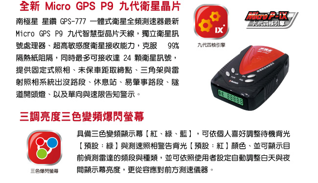 南極星 星鑽 GPS-777 衛星超級雷達採用最新 Micro GPS P9 智慧型晶片,九代四核處理器、獨立衛星訊號處理器、超高敏感度衛星接收能力,克服 99% 隔熱紙阻隔,提供更精準定位能力。