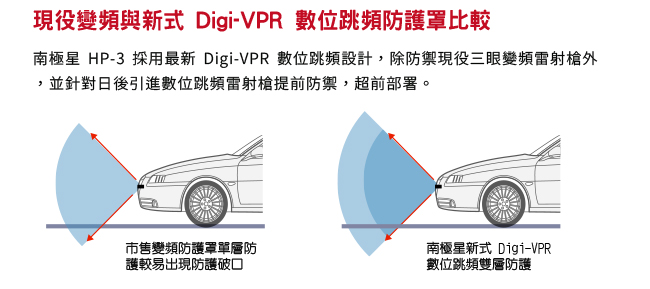 南極星 HP-3 Plus 旗艦版數位二極體防護罩採用最新Digi-VPR數位跳頻設計,除可防禦目前交通隊現役三眼變頻雷射槍外,並針對交通隊日後引進 Digi-VPR 數位跳頻雷射槍提前防禦,為保障您的荷包,超前部署。